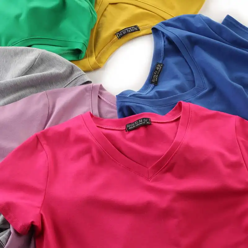 شراءمعلومات اضافية 15 الألوان! زائد حجم M-3XL النساء T قميص V الرقبة الصيف قصيرة الأكمام الصلبة التي شيرت بلون الأساسية أعلى تي شيرت الإناث تي شيرت