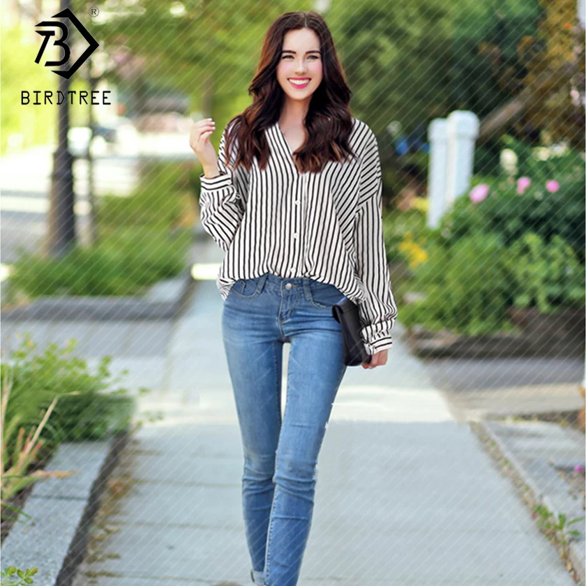 شراءمعلومات اضافية 2019 جديد إمرأة الأبيض مخطط T قميص V الرقبة جاكيت كاجوال أنيقة الإناث فضفاض Ruched أعلى زائد حجم 5XL تيز الساخن T8D736C