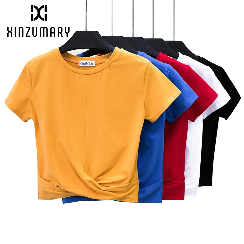أرغب في شراءمعلومات اضافية المرأة تي شيرت الصيف عبر شكل تي شيرت قصيرة الأكمام س الرقبة عارضة الصلبة الإناث القطن عالية الخصر ضئيلة Croptop تي السراويل