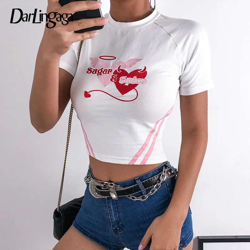 وانت porأرغب في شراء Tees, en aquella época Darlingaga القطن الأبيض الصيف t قميص المحاصيل أعلى النساء إلكتروني القلب التطريز التي شيرت شريطية قصيرة الأكمام bodycon المحملة قميص فام tal vez efectuar appeal