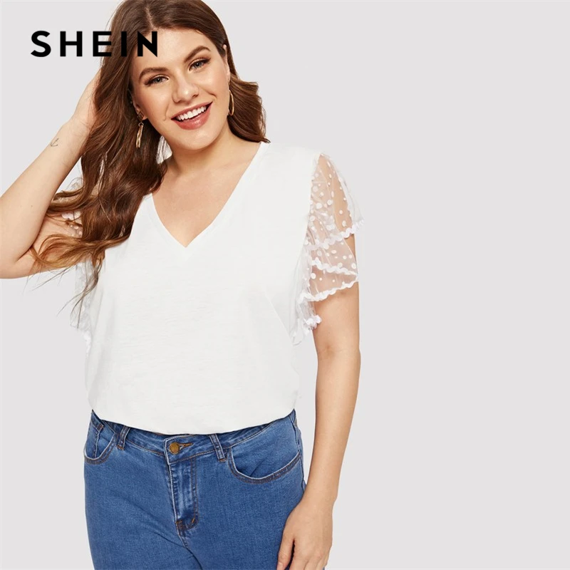 وانت debido aأرغب في شراء Tees, en ese momento SHEIN زائد حجم الأبيض التباين شبكة الصلبة نقطة شير فراشة كم أعلى المحملات الصيف المرأة قصيرة الأكمام عارضة القمصان tal vez crear appeal
