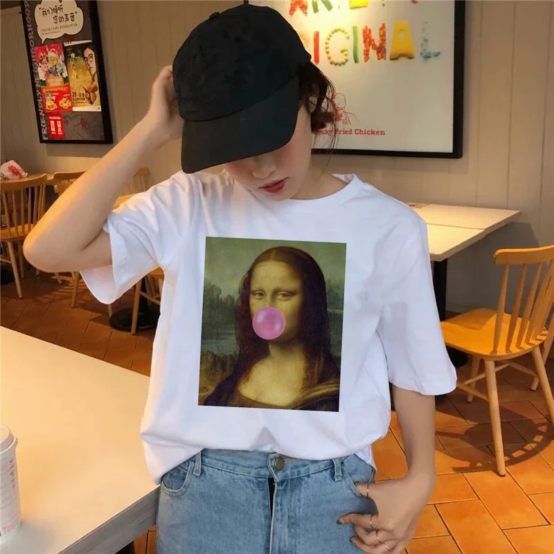 صور من الموناليزا T قميص الهيب هوب التي شيرت النساء الإناث مضحك الأعلى المحملة القمصان تي شيرت المتناثرة 90 s الشارع الشهير عارضة المطبوعة جديد الكور...