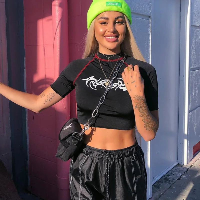 البحث عن معلوماتمعلومات اضافية أسود طباعة مثير T قميص 2019 الصيف الشارع الشهير عارضة الجرافيك تيز المرأة موك الرقبة قصيرة الأكمام المحاصيل قمم